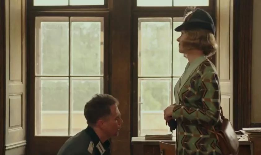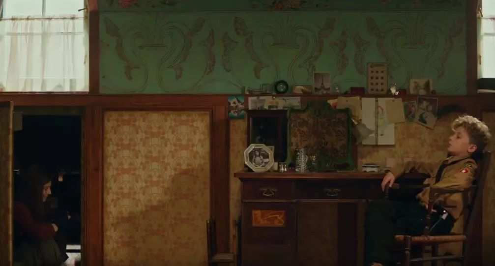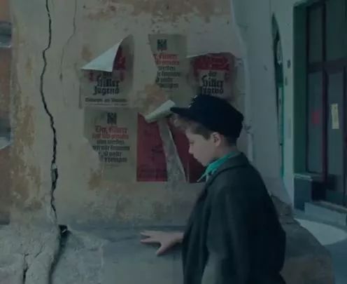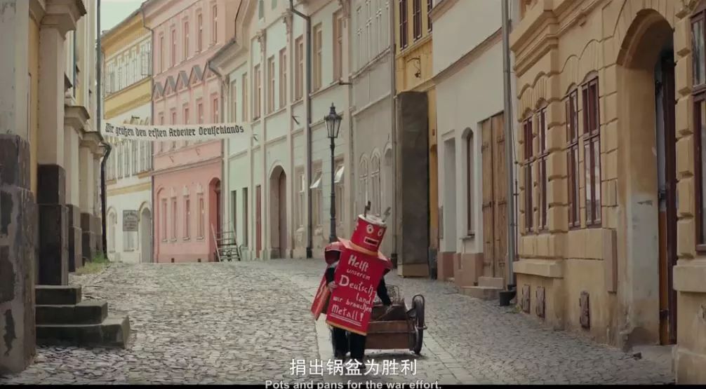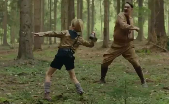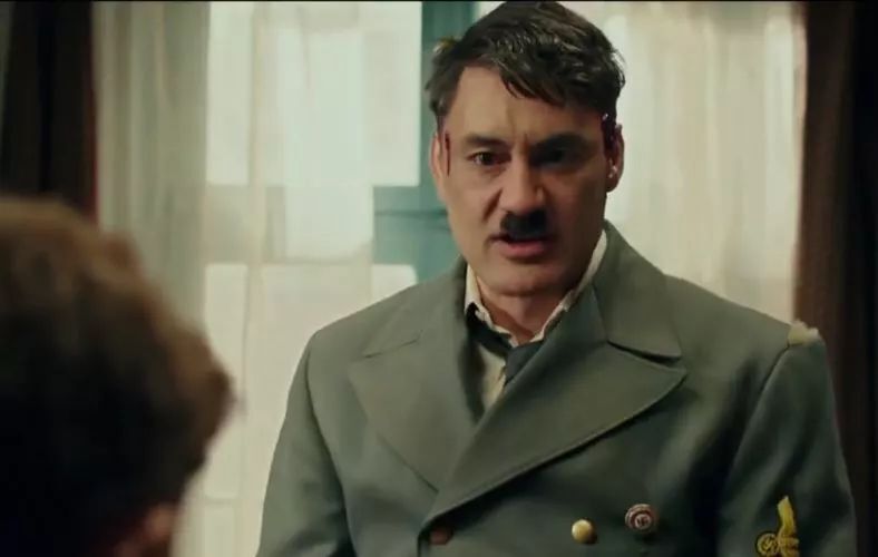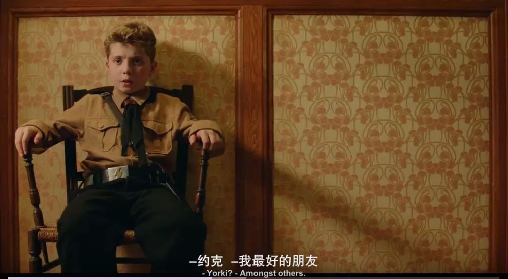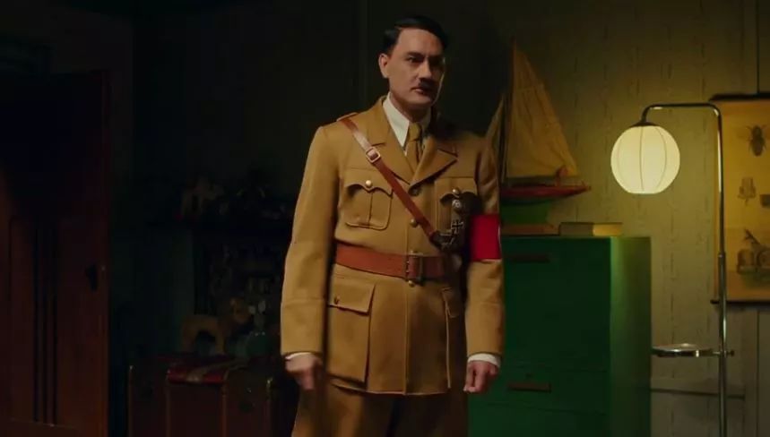 在喬喬的想象中,他的元首還是一幅中青年時代的模樣,身上穿著一套納粹沖鋒隊的褐黃色制服。當兩個“小黃人”擠在一起大眼瞪小眼時,本身便自帶一種喜劇效果。而影片絕大多數的外景,都發生在陽光明媚的世界里,小鎮中亦有多座淡黃色的建筑物,這種高亮度和低飽和度的小清新組合,讓電影自然呈現出一種積極向上的格調。