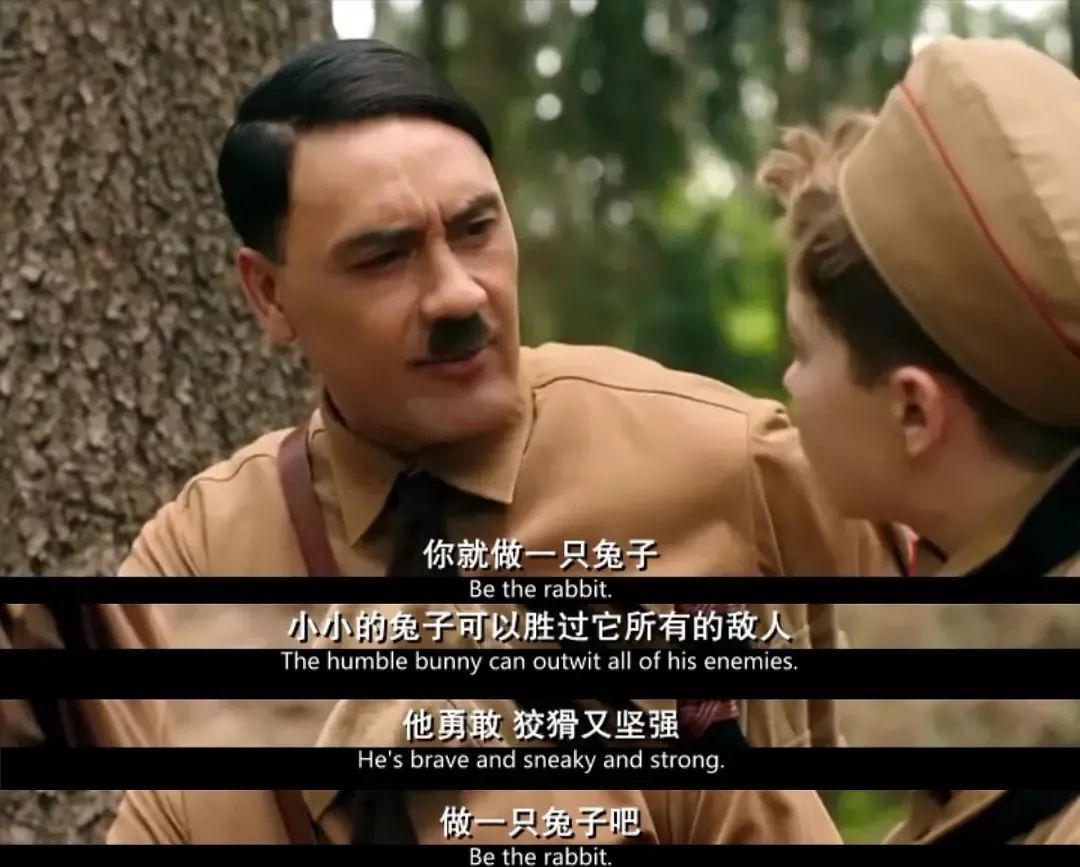 ③兔子的第3次出現是在喬喬與希特勒的精神對話中,某種程度上反映了小男孩的自我安慰與心理防御機制,讓人想起后半段在炮火屠殺中堅強求生的JOJO。