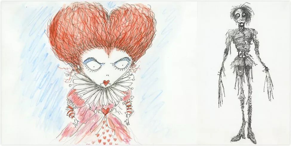 蒂姆·波頓設計的紅桃皇后與剪刀手愛德華的人物草圖