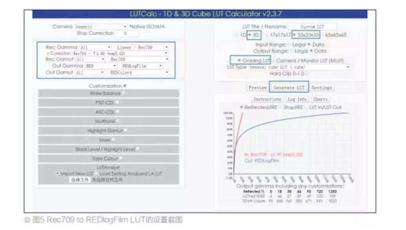 LUTCalc 中預(yù)置了現(xiàn)在主流攝影機的色域、Gamma 曲線、 Rec.709 標(biāo)準(zhǔn)等參數(shù)。 經(jīng)過作者的測試, LUTCalc 完全可以用來制作 Rec.709 to Log類型的 LUT, 可以滿足一般制作的需要。 圖 5 為制作Rec709 to REDlogFilm LUT 的設(shè)置截圖。