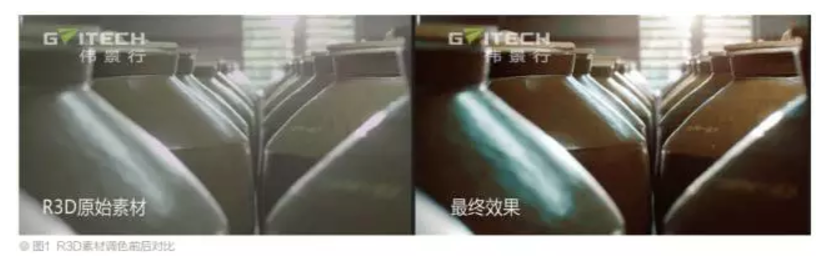 對于 R3D 素材, 按照一般習(xí)慣我們將色彩空間設(shè)為 REDcolor4,Gamma 曲線設(shè)為 RED logFilm。在R3D 素材上加載 Log Kino35 ORIG STANDARD WB 的 LUT, 并增加節(jié)點, 根據(jù)畫面實際情況進(jìn)行飽和度和反差的調(diào)整。 R3D 素材調(diào)色前后對比如圖 1 所示。