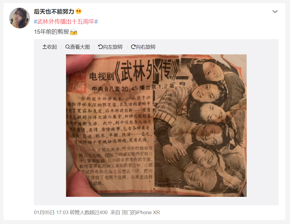 導演尚敬在微博上問道:“15年了,你們還好嗎?”評論區很快收集了很多80后、90后感人的回憶——“我所有的積極向上都是當年《武林外傳》給的”。