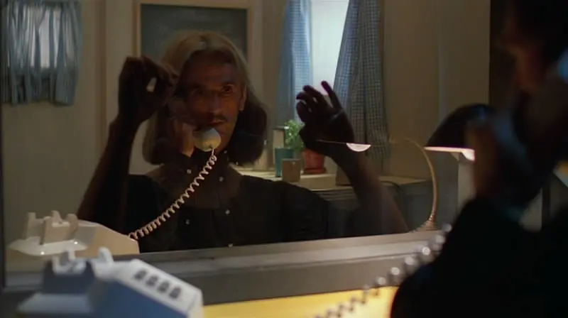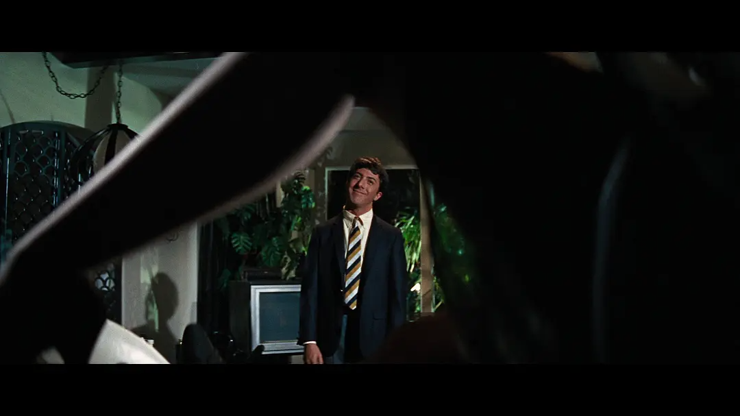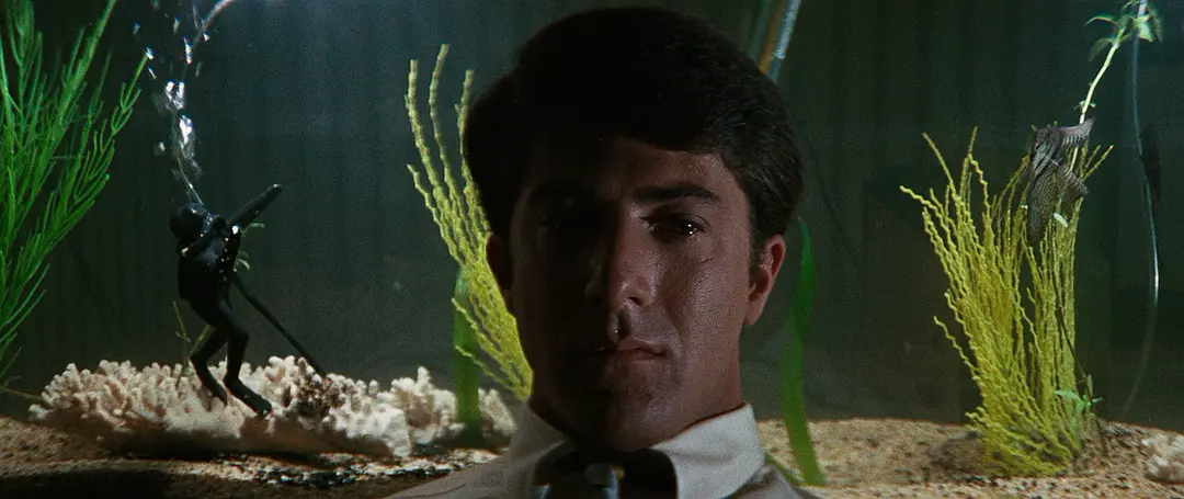 不同的寓意總是會出現在你對構圖的選擇上。如果在框架式構圖中,畫面中的主體與框架看起來比較緊而且受約束,這可能會使畫面產生幽閉恐懼的壓迫感。在上面圖中,我們看到Ben(由達斯亭霍夫曼扮演)坐在魚缸前。大學畢業后,他試圖弄清楚自己的生活到底該怎么辦。注意在魚缸中里的海藻如何在Ben的頭部周圍形成一個封閉的框架。這種海藻可以看作是Ben焦慮的隱喻。魚缸中的小人用魚叉在Ben的頭上增加了一個特殊的滑稽感。Ben的父親入畫,頭部遮住了浴缸中的小人,并在畫面內創建了第二個更加壓迫的框架。