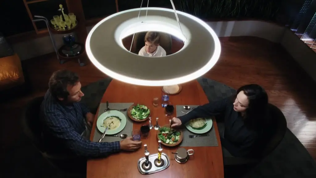 《人工智能》圓形燈具暗示小機器人與父母吃飯時的隔閡感,由海利·喬·奧斯蒙特扮演。后來在電影中,畫面內的圓形框架被用來作為一個暗示的機會,達到突出角色目的的效果。