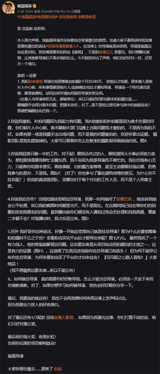 1月29日,《玲瓏》開播當晚,導演施磊發微博斥責片方,稱自己“番位被搶”,拍攝完成之后才知道總導演另有其人。隨后,《玲瓏》總導演徐奕明發文回應,質疑施磊業務能力問題,稱其為借時機炒作。《玲瓏》的導演署名爭議在行業內算個例,這其中的主要爭議點在于導演和總導演的職責劃分不清。經娛理工作室調查發現,行業內真正的掛名亂象和陷阱更多集中于監制、策劃,甚至已經有人開始以此行騙。微博發出之后,娛理工作室聯系到導演施磊。據他表示,當年是經圈內朋友介紹認識了唐人影視總裁蔡藝儂,并參與到了《玲瓏》項目中,“當時他們給我介紹的是編劇徐奕明,監制也是他。”簽約時,施磊簽署了導演、聯合導演兩份合同。