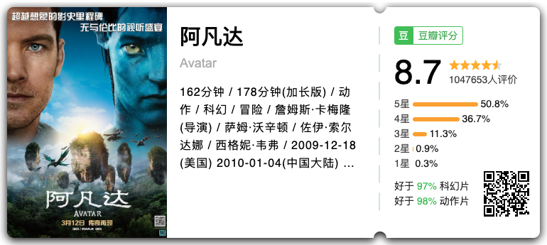五一檔大片金球獎最佳影片、最佳導演,奧斯卡最佳藝術(shù)指導、最佳攝影、最佳視效(最佳影片、最佳導演輸給前妻凱瑟琳·畢格羅)…它當年斬獲了89項電影節(jié)大獎。歷史上第一部全球票房達到10億美金的3D電影,開創(chuàng)3D電影新時代。內(nèi)地票房破13.4億,成為中國內(nèi)地第一部10億電影。在豆瓣,105萬打出8.7,穩(wěn)居豆瓣電影TOP250榜單的第89位。當年,保持近10年紀錄的它,在2019年7月20日被《復仇者聯(lián)盟4》(票房27.978億美元)超越。如果重映票房突破5000萬元,就可以拿回“全球票房第一”。