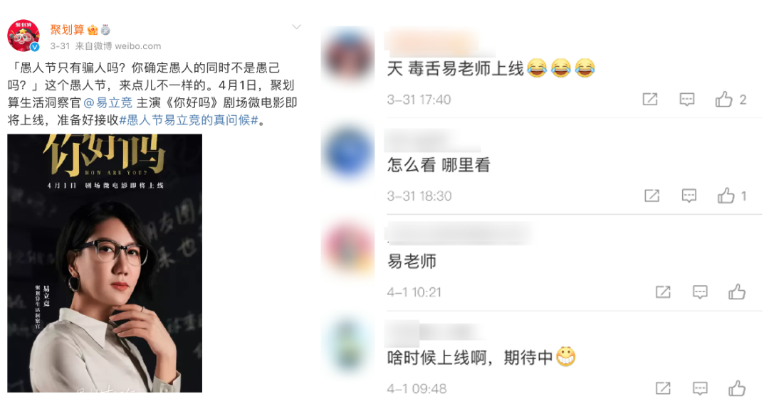 緊接著,《你好嗎》劇場微電影在愚人節當天全網發布后,不僅憑借微電影本身出其不意的洞察點引發了網友的熱議,也衍生出大量意味十足的優質評論,為聚劃算這場愚人節營銷事件的發酵持續蓄能。