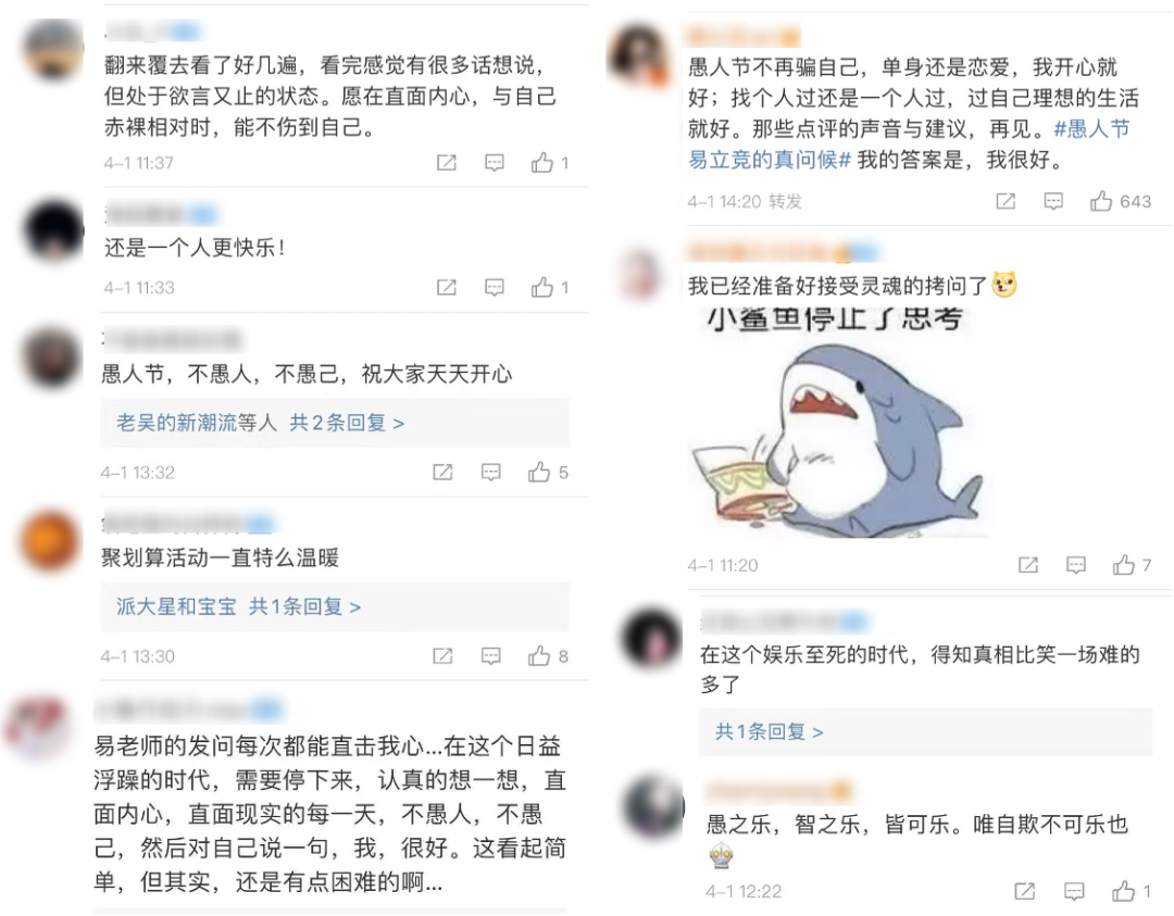 這個主題乍一看讓人摸不著頭腦,但結合現實社會的熱點事件、愚人節的節日涵義、以及吐槽大咖易立競的犀利風格這三點細品之后,阿廣發現:這里面暗含著幾層觸動用戶共鳴的“巧勁”。