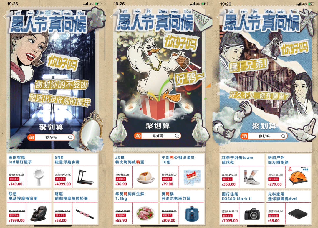 另一方面,聚劃算在站內也打造了承接流量的入口,愚人節當天只要在手機淘寶搜索輸入「你好嗎」問候語,就能得到聚劃算給你的愚人節真問候,連問候文案都是梗點不斷的愚人節風格。