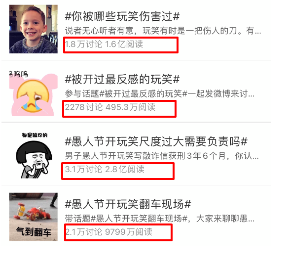 可以說,聚劃算這次的愚人節營銷不僅在形式上一反“愉”人套路,在內容上也巧妙結合了廣受大眾關注的戀愛、性別對立、教育理念等社會問題,與#你被哪些玩笑傷害過#、#愚人節尺度#等引發討論的熱搜話題不謀而合。