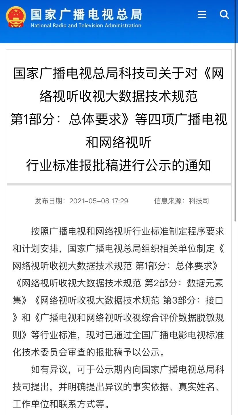 2021年5月,廣電總局公布了“國家廣播電視總局科技司關于對《網(wǎng)絡視聽收視大數(shù)據(jù)技術規(guī)范第1部分:總體要求》等四項廣播電視和網(wǎng)絡視聽行業(yè)標準報批稿進行公示的通知”,進一步整治數(shù)據(jù)注水。