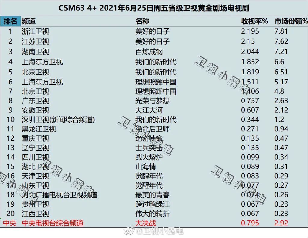 以《美好的日子》為例,CVB公布的收視率在6月25日這一天,江蘇衛(wèi)視為0.245%,浙江衛(wèi)視為0.334%,而CSM63城收視率則顯示,浙江衛(wèi)視的收視率為2.195%,江蘇衛(wèi)視2.15%。