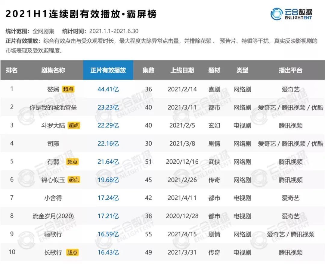 網(wǎng)劇市場依舊由大古裝霸屏。據(jù)云合數(shù)據(jù)統(tǒng)計,2021年上半年全網(wǎng)連續(xù)劇有效播放霸屏榜前三甲為《贅婿》《你是我的城池營壘》《斗羅大陸》。其中《你是我的城池營壘》為三家視頻平臺聯(lián)播,排在第4位的《司藤》也是如此。