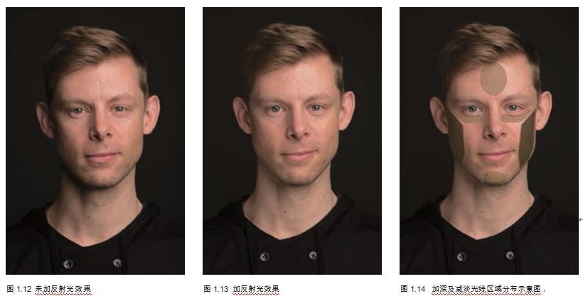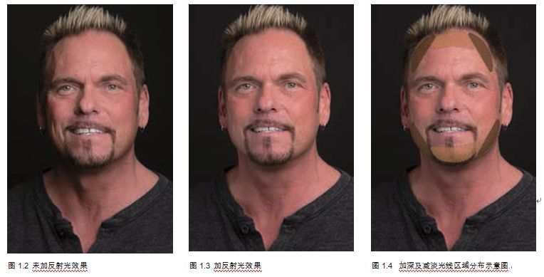 就像你在圖1.34中看到的一樣,你需要暗化拍攝對(duì)象前額邊緣的兩角及顴骨,同時(shí)在其前額中 心和下巴處加高光,這樣便可以得到和圖1.35相似的拍攝效果。