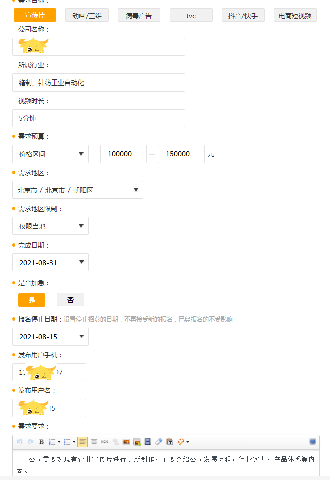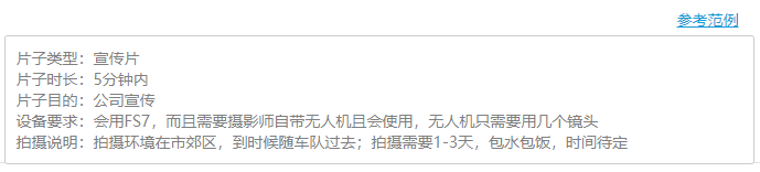 發(fā)布需求頁面中,你完全可以根據(jù)自己的項(xiàng)目需求填寫真實(shí)的拍攝要求,甚至可以任性的要求本地的服務(wù)商進(jìn)行拍攝服務(wù)。